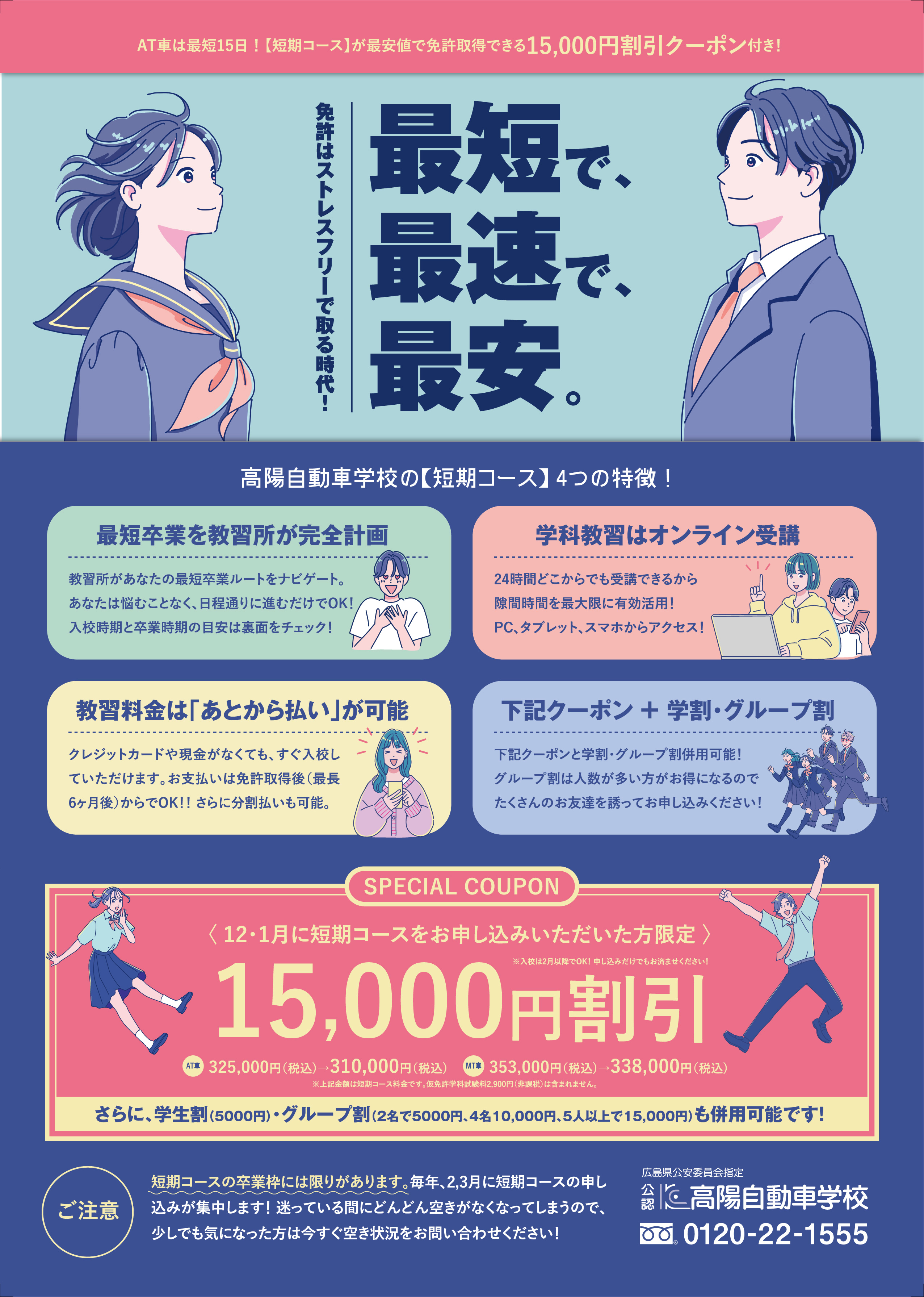 12・1月中に高陽自動車学校の「短期コース」にお申し込みください!!